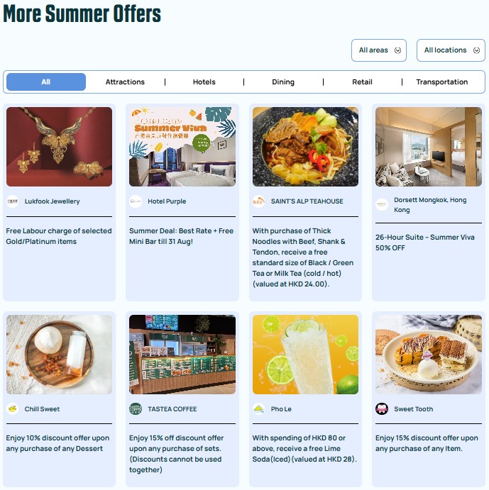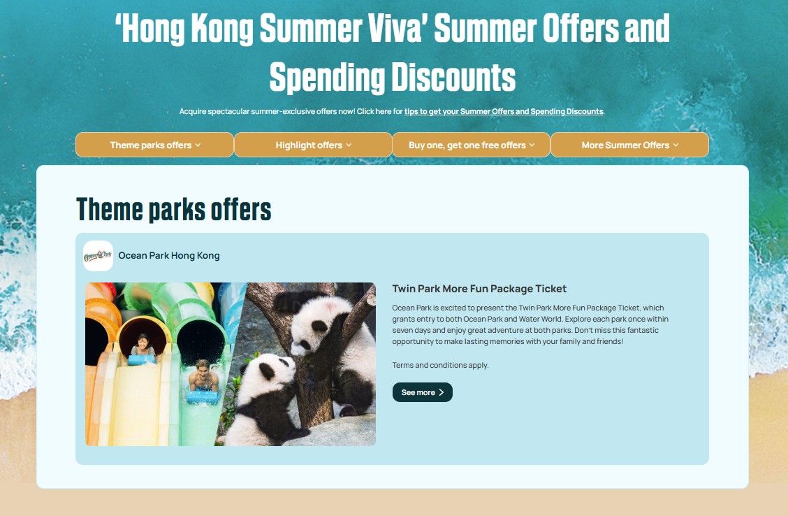 Check the terms and conditions of offers before collecting or redeeming for offers “Hong Kong Summer Viva” offers and discounts can be collected on the dedicated campaign page. Redemption methods may differ for each offer. Most of the offers and discounts are available for collection or redemption until 31 August. Locals and visitors are advised to refer to the terms and conditions of each offer before collecting or redeeming for offers. Certain offers are available to registered