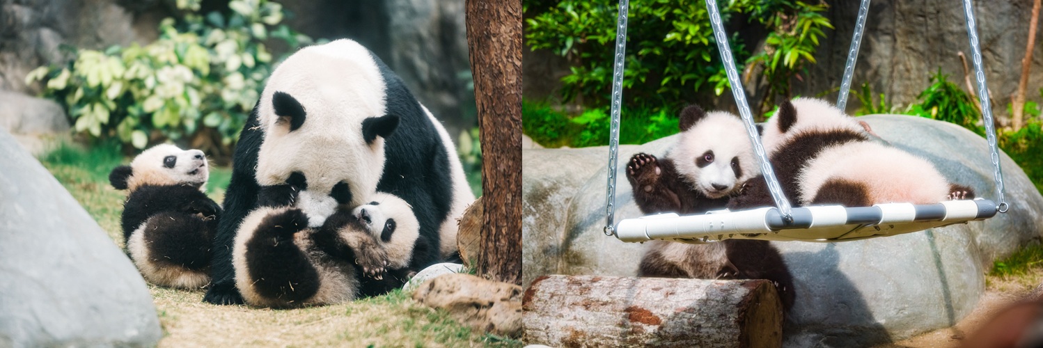 テーマパーク「香港オーシャンパーク(Ocean Park Hong Kong / 香港海洋公園)」で 2024 年8 月15 日に誕生したジャイアントパンダの双子。 今年2月16日から一般公開され、 姉パンダは「加加(ジャジャ)」、弟パンダは「得得(ディディ)」と名付けられました。 両親の「盈盈(インイン)」と「楽楽(ラーラー)」、 そして2024年9月26日に四川省から新たに贈られてきた「安安(アンアン)」と「可可(カカ)」もいて、 現在、香港オーシャンパークでは中国本土外では最多の6頭のパンダが皆様の来園をお待ちしています。