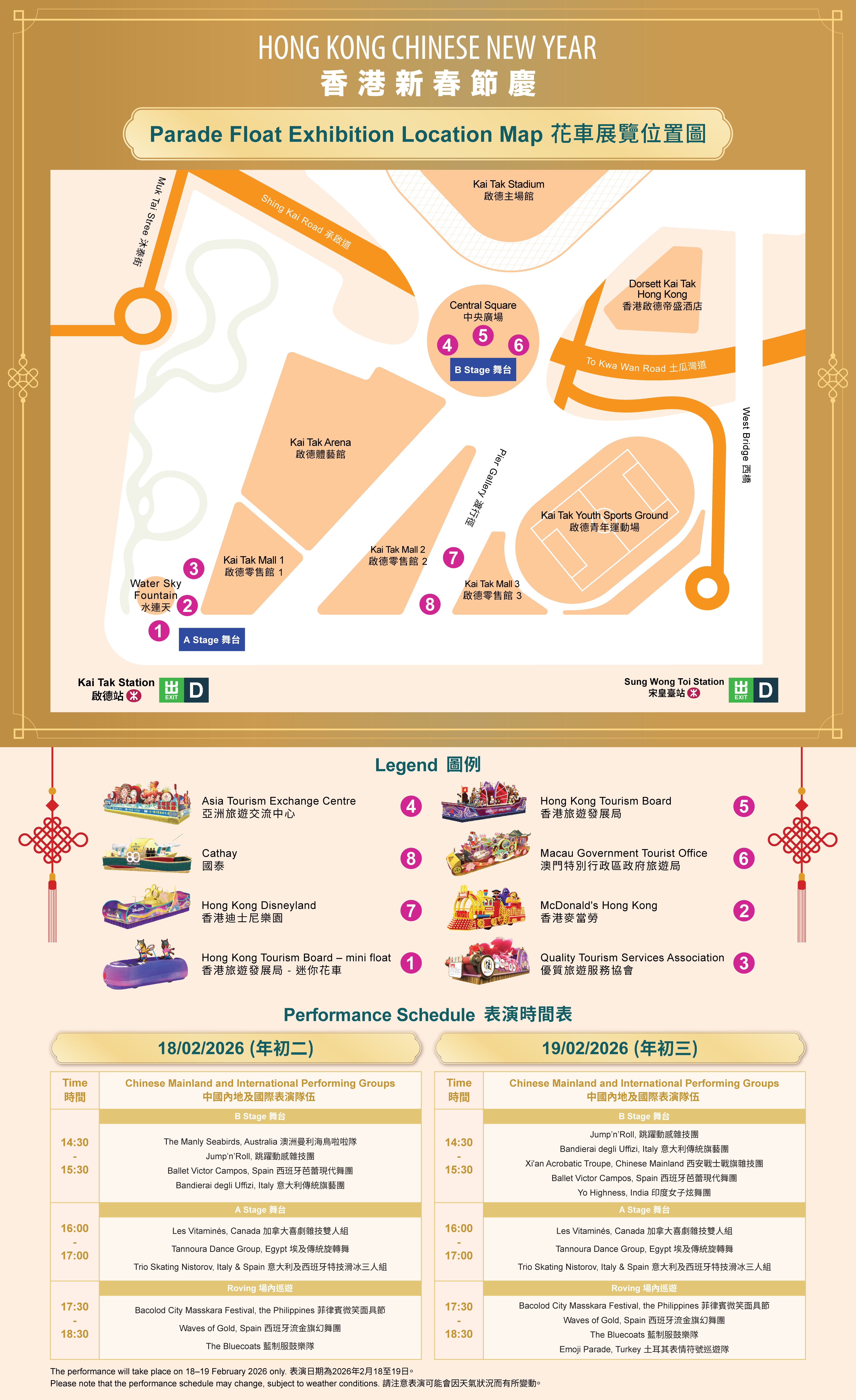 From the second day of Chinese New Year (18 February) to the 16th day (4 March), the floats will appear at various locations across the city to continue the excitement of the parade. For the first time, eight distinctive floats will be displayed at Kai Tak Sports Park. On the second and third days of Chinese New Year (18 and 19 February), Chinese Mainland and international performing teams who participated in the parade will perform live on two temporary stages at the venue, bringing the festive atmosphere to the audience.