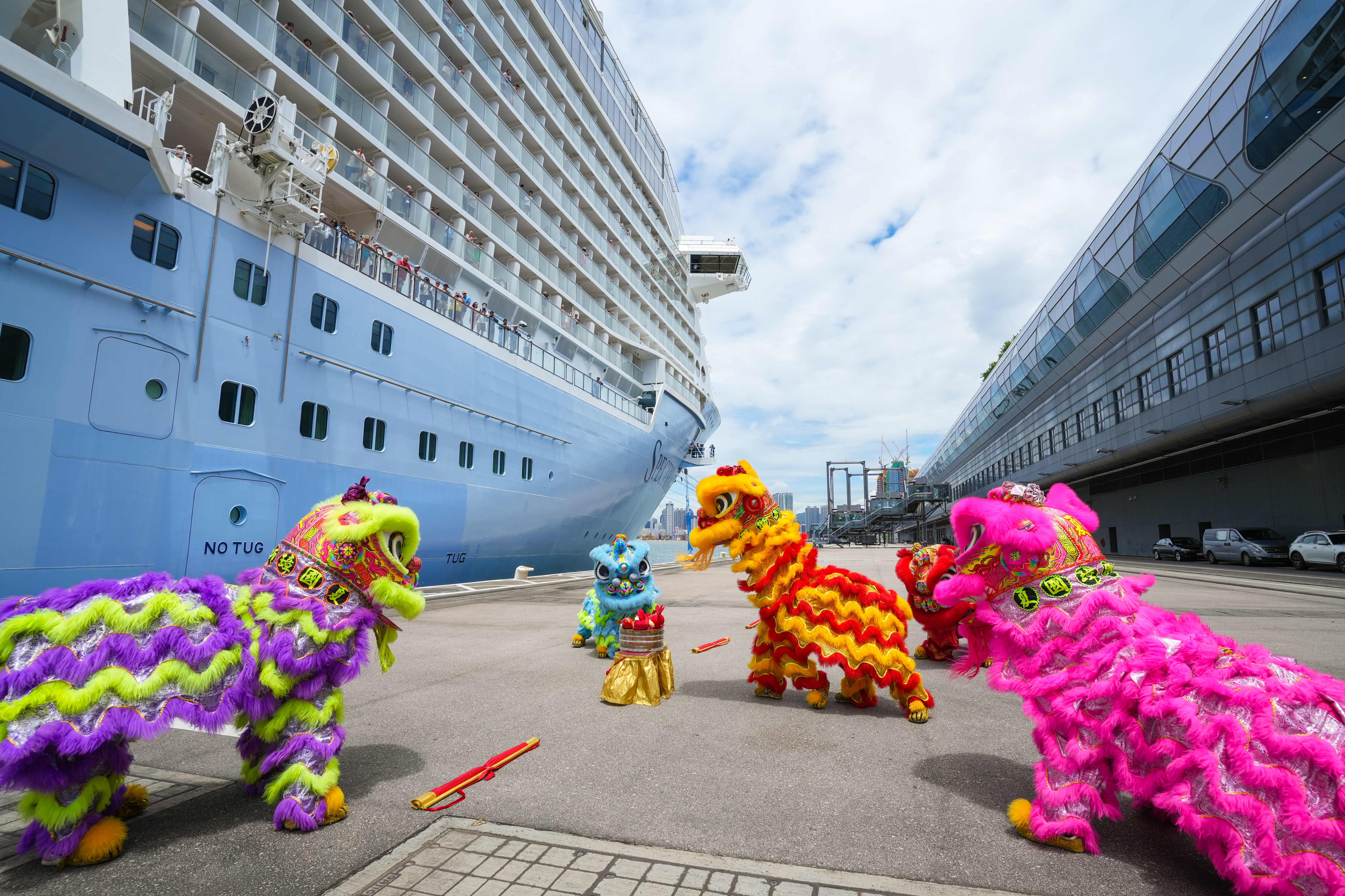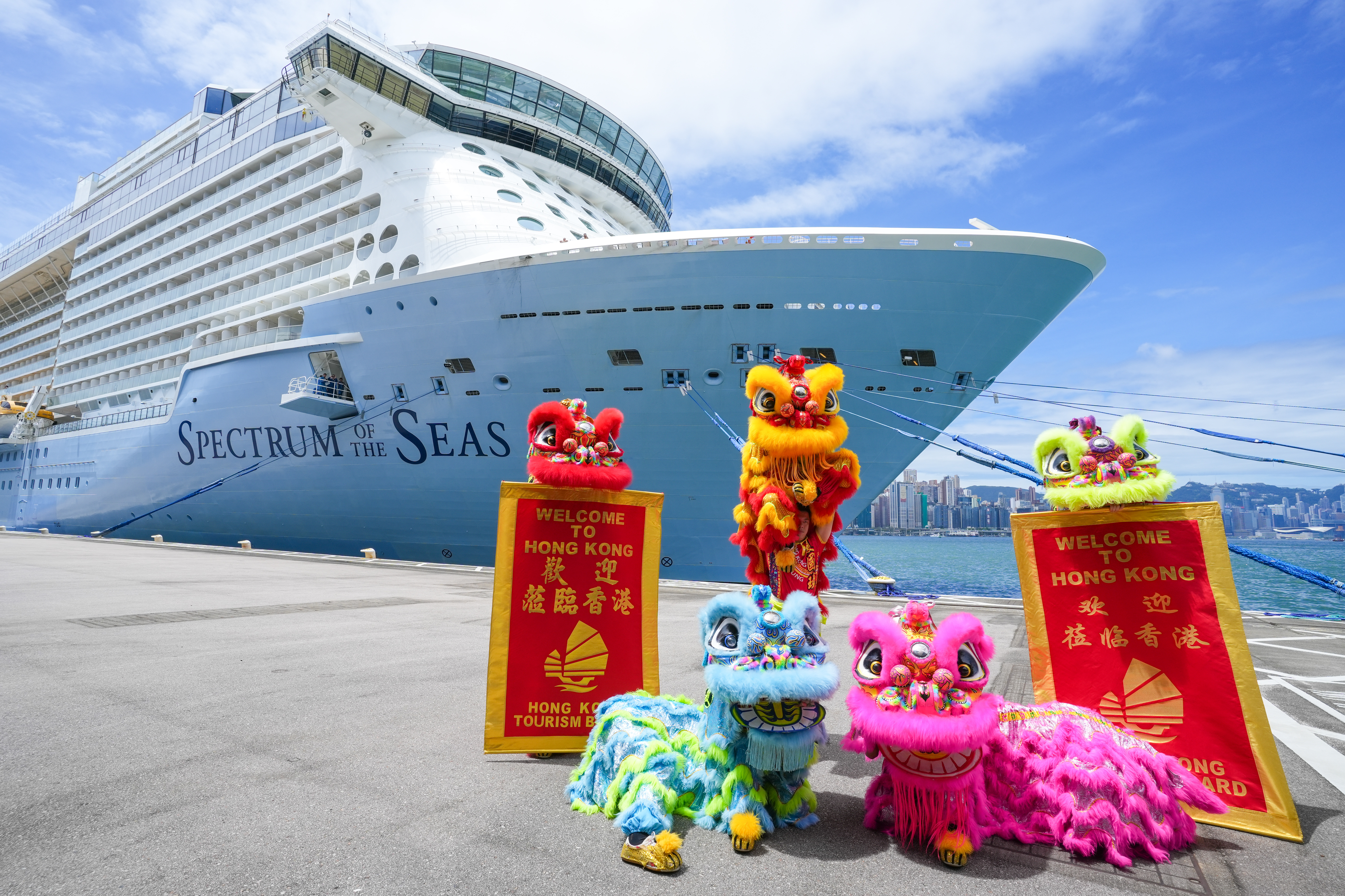香港旅游发展局(旅发局)欢迎皇家加勒比国际游轮旗下"海洋光谱号"在疫后首次重返香港,并落实将于2024年再次以香港作为母港。旅发局今日(8月4日)特别在启德邮轮码头举行欢迎仪式,以生动活泼醒狮及热闹锣鼓表演助兴,迎接"海洋光谱号"回归,并向抵港旅客派发小礼物。