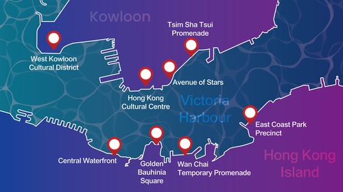 Eight Vantage points with On-Site Sound Systems Eight locations along the coast of Victoria Harbour will provide the best views of the New Year countdown fireworks display: West Kowloon Cultural District; the Piazza of Hong Kong Cultural Centre; Avenue of Stars; Tsim Sha Tsui Waterfront Park; the Central Harbourfront Promenade; Golden Bauhinia Square; the Wan Chai Temporary Promenade; and the East Coast Park Precinct. All eight spots will be equipped with sound systems for a multi-sensory experience. Enjoy the New Year countdown fireworks display from different angles at these different locations!